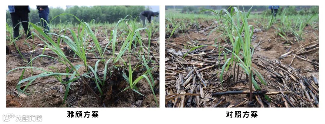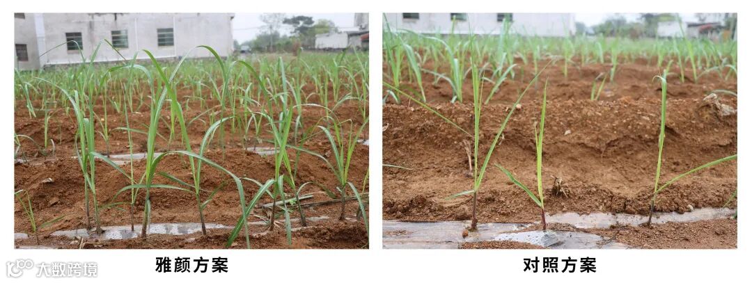 新植甘蔗在使用雅颜方案后,株高叶长增加,茎杆直径增加,出苗率高于对照组。