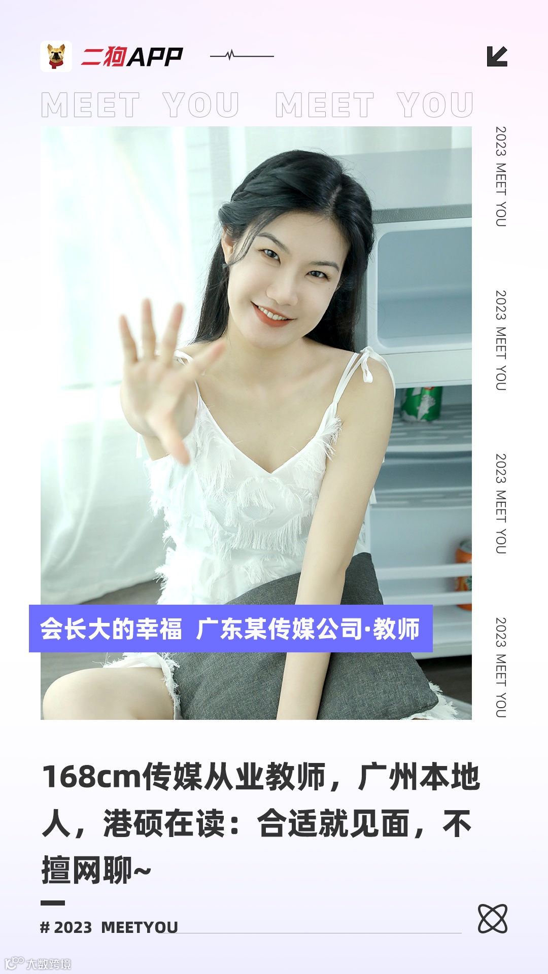 爱笑、有生命力,目前一切安逸,也没有停止学习,在读硕士,始终在为能够创造更美好的努力生活着,人生规划有101个目标,仍望与另外一半一起实现。