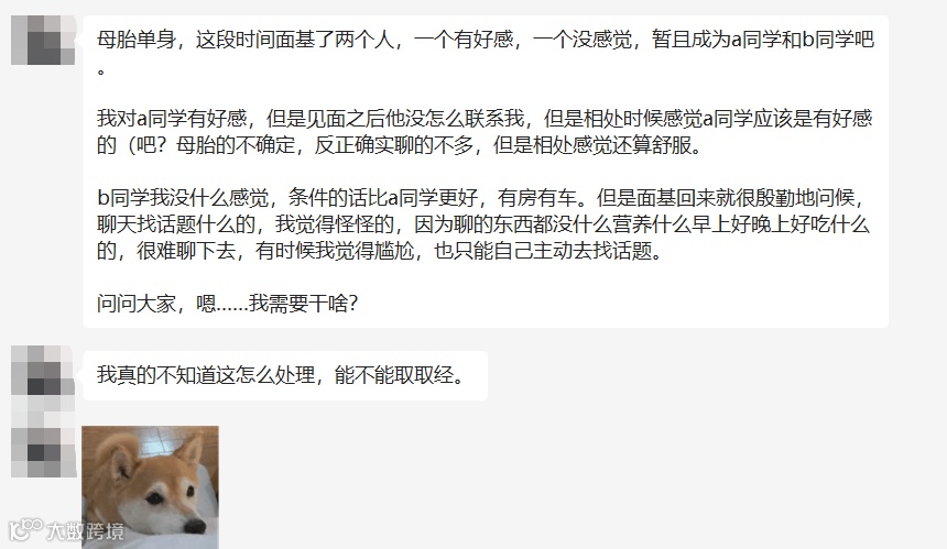 今日话题:投稿人母胎单身妹子,面基了两个人,现在对于怎么处理面基后的事情,不知所措,你觉得该怎么办?