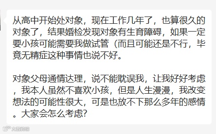 今日话题:投稿人是女孩子,但是男方存在生育障碍,她现阶段不喜欢小孩,但是也说不准以后怎么样,可以和男方成家么?你怎么看?