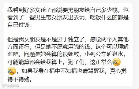 今日话题:男方感觉两个人其他方面还行,但是女朋友不愿意用他的钱,这会算的很细致,小到公车矿泉水,可能能算都会算上。这是奇怪的现象么?