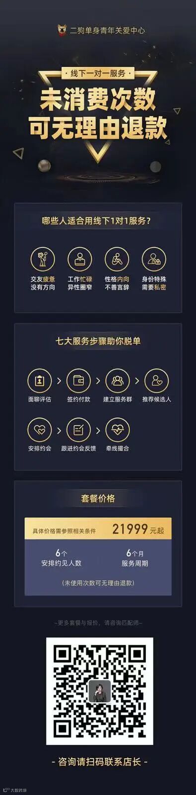 我们会建议你考虑使用线下一对一匹配服务,帮助你更快脱单,早日找到心仪对象,进入幸福的两人世界。