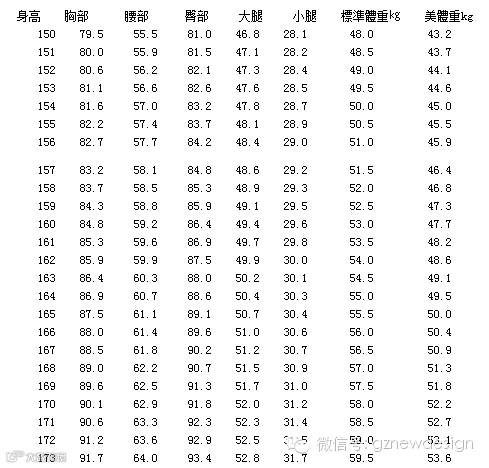 中國女性美體曲線對照表