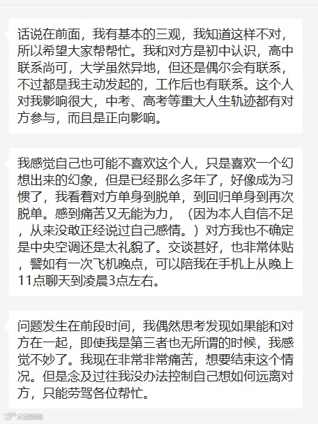 今日话题:这次投稿的女生理智清楚,但是对于曾经影响自己很多的一个暗恋对象难以割舍,甚至有危险的想法,她想要快点打破目前的局面,希望大家能够帮帮忙。