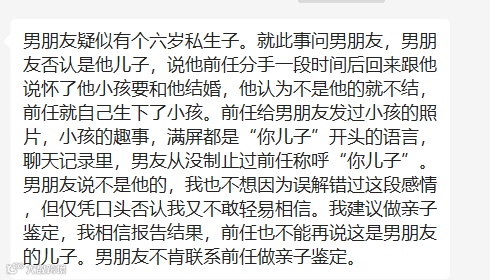 今日话题:男友疑似有私生子,但他因前任难缠而不愿意做亲子鉴定,她要怎么办。