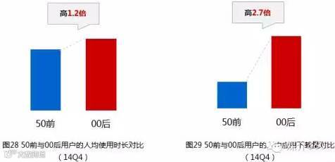 与50前用户相较,同样作为移动互联网的全新增量,00后的行为模式和习惯,活跃度更为显著。在人均使用时长上,00后是50前的1.2倍。人均下载应用量上,00后是50前的2.7倍。