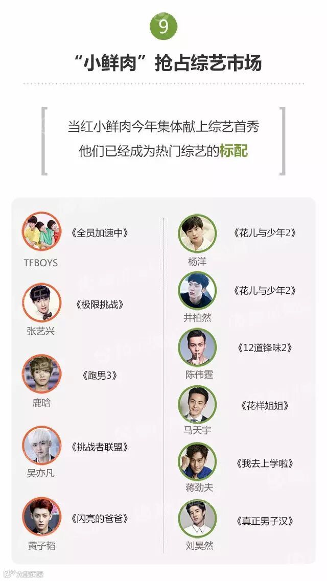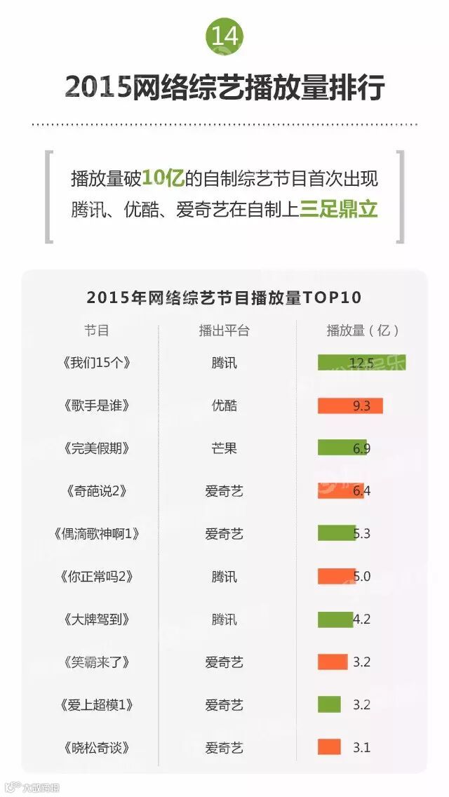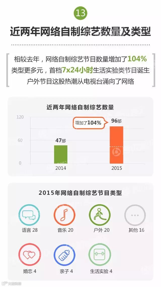 2015年,视频网站在自制方面全面发力。综艺节目类型全面开花,数量同比增长104%,制作规格也开始向电视台靠拢。一方面,何炅、汪涵、蔡康永等电视主持加盟网生综艺,另一方面,《我们15个》《歌手是谁》《爱上超模》《十周嫁出去》等网综反输出给电视平台。