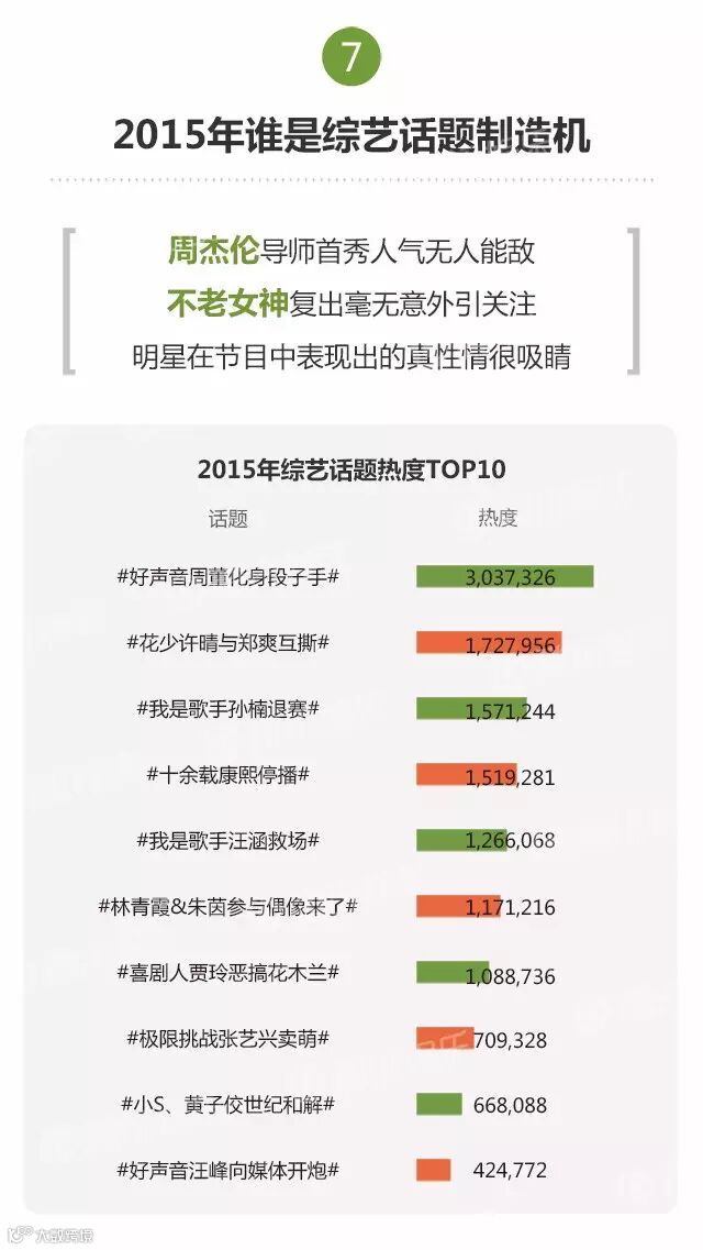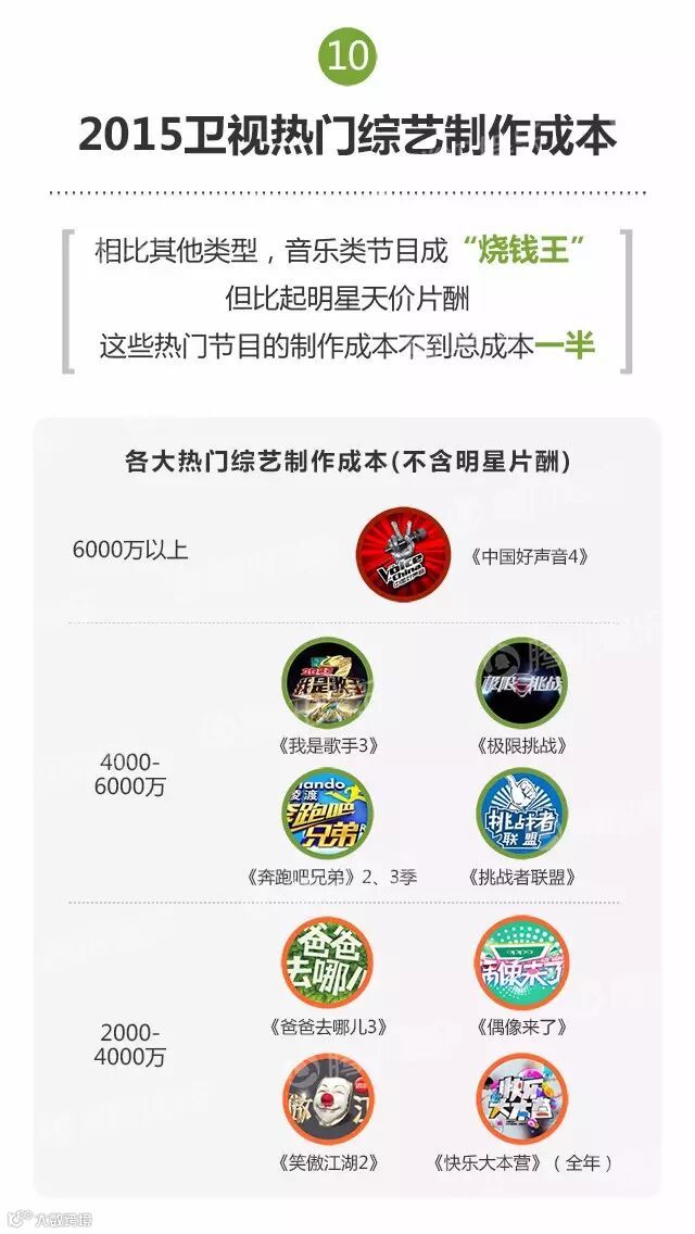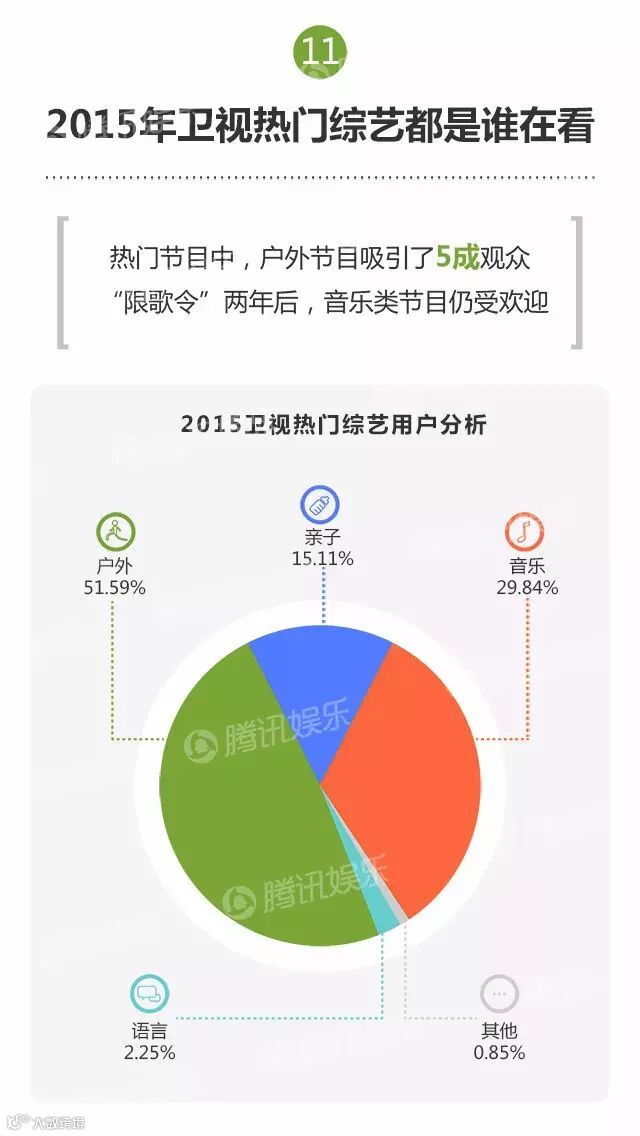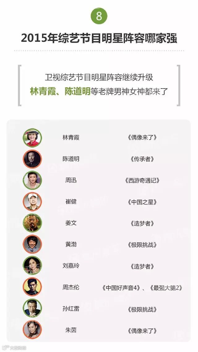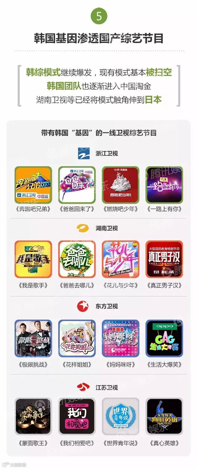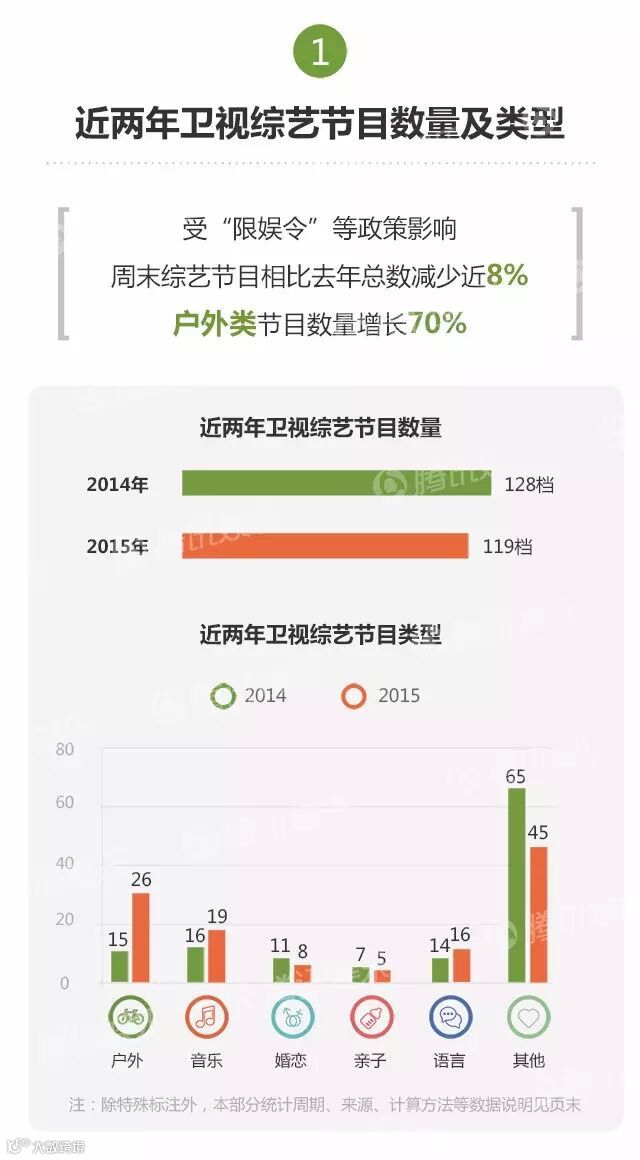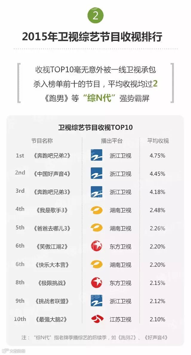 2015年,共有215档综艺节目面世。其中,热门综艺被一线卫视承包,同时缺乏新“现象级”节目,《奔跑吧兄弟》《中国好声音》《爸爸去哪儿》《我是歌手》等“综N代”依然霸屏。