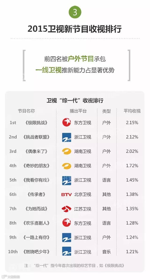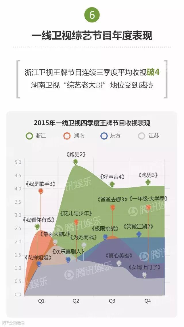 今年,浙江卫视凭借《奔跑吧兄弟》和《中国好声音》两档节目,实现连续三个季度收视破4。东方卫视也凭借《极限挑战》在暑期实现爆发,进入准一线。江苏卫视虽推出多档新节目,但整体收视表现欠佳。