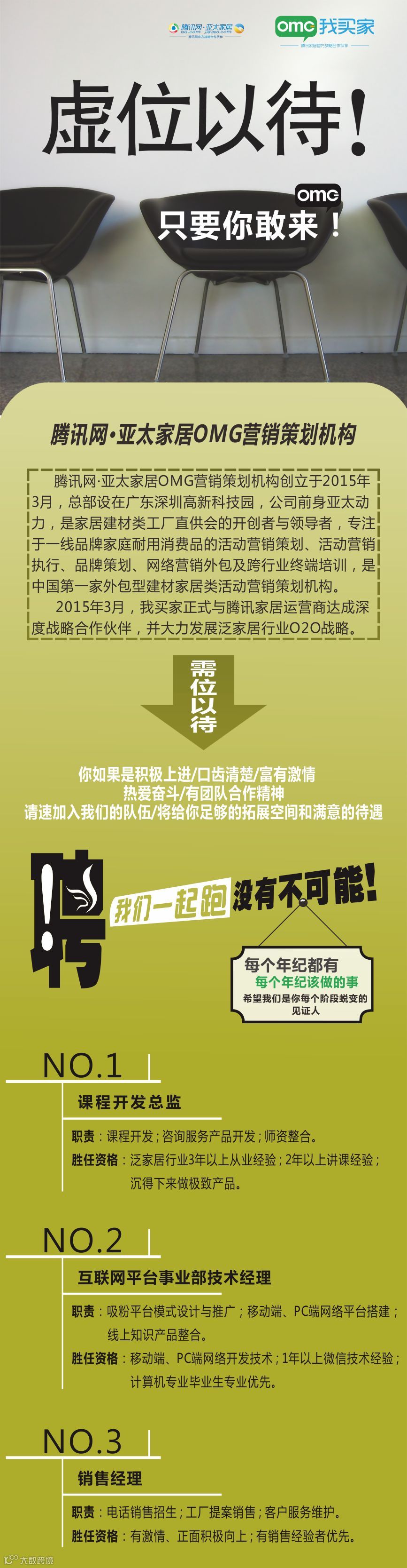导读:你想不想深切体会这个时代的激情、拼搏或是喜乐?如果你是强者,却一直苦于找不到伯乐,那么、现在机会来了:【虚位以待】向全国招募,来这里,我们给你上升空间!