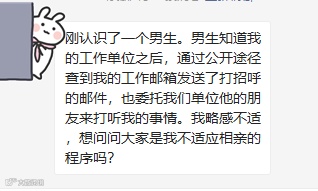 投稿简介:相亲认识的男生,通过公开途径查我的工作邮箱,给我发邮件,委托他的朋友(我同事)打听我的事情,我略感不适。请问这是相亲的正常程序吗,还是我太敏感?