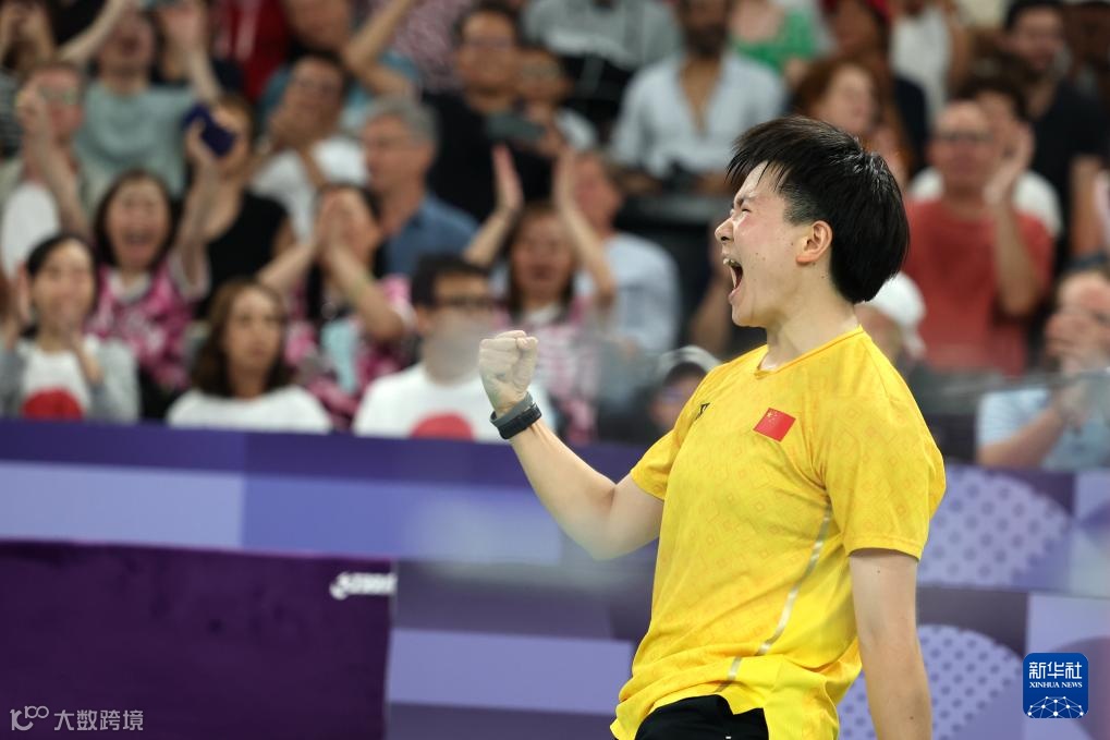 8月1日,中国选手何冰娇在比赛中庆祝得分。