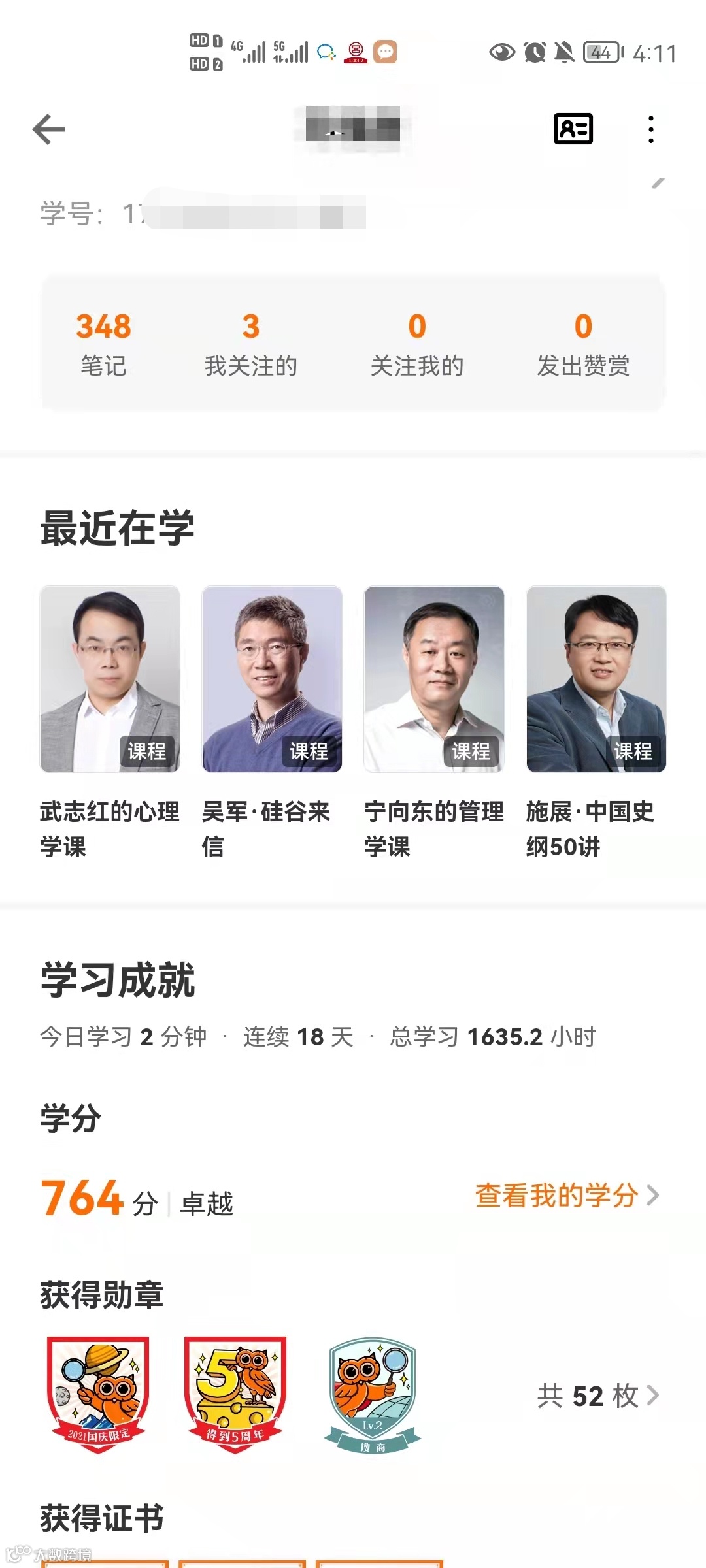 *我是兴趣爱好很广泛,时刻对世界充满好奇。但有限的时间让我选择了专注,现在最喜欢的是读书学习,我是得到APP第一批兼重度用户。5年前我偶然进入了这个奇妙的知识世界,由此开启了我人生的逆袭之路。已在得到上学习1600多个小时,今年又加入了樊登读书。比较吸引我的书是心理学和历史学。