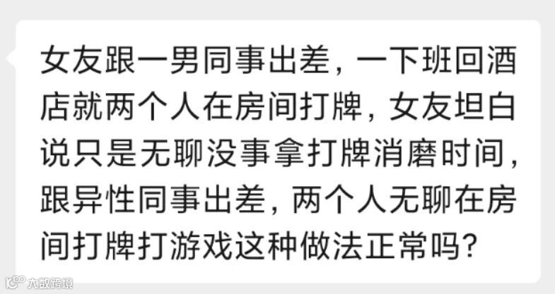 一位男生投稿说,女友跟一男同事出差,一下班回酒店就两个人在房间打牌,女友坦白说只是无聊没事拿打牌消磨时间。