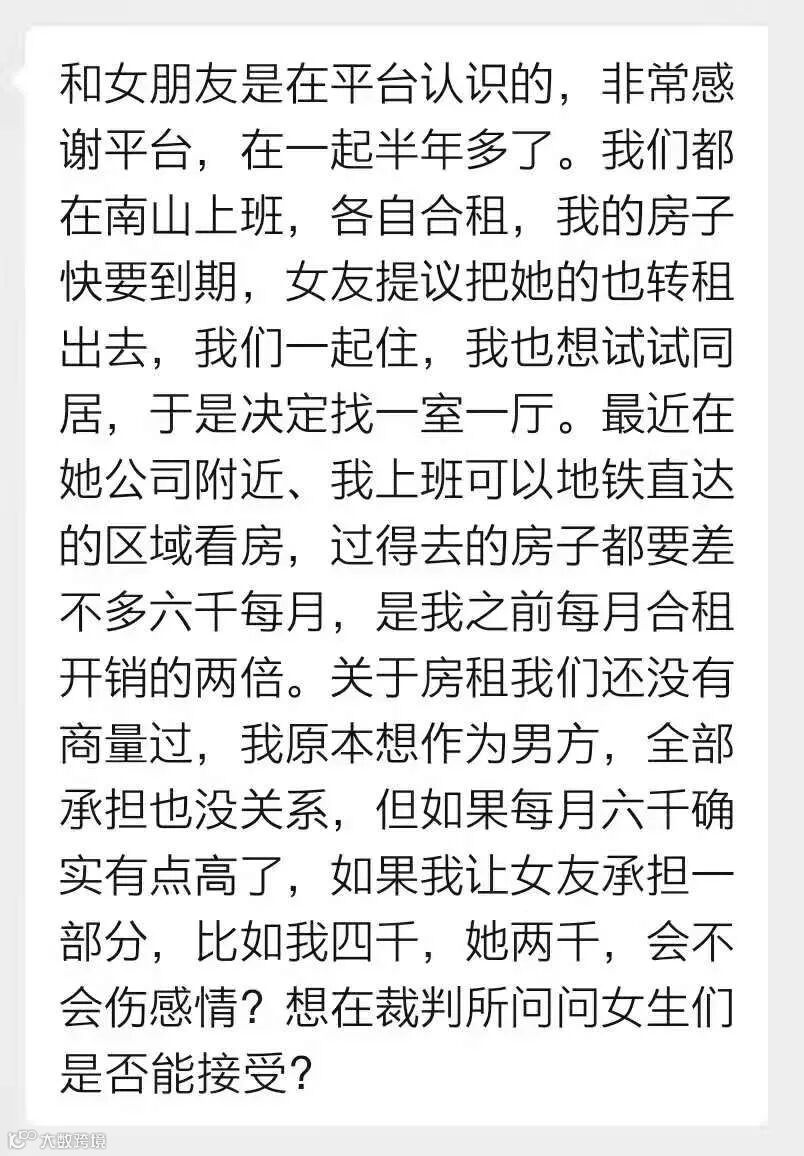 他想在裁判所问问大家,如果他和女友提出,让女友承担一部分房租,比如他出四千,女友出两千,会不会伤感情?