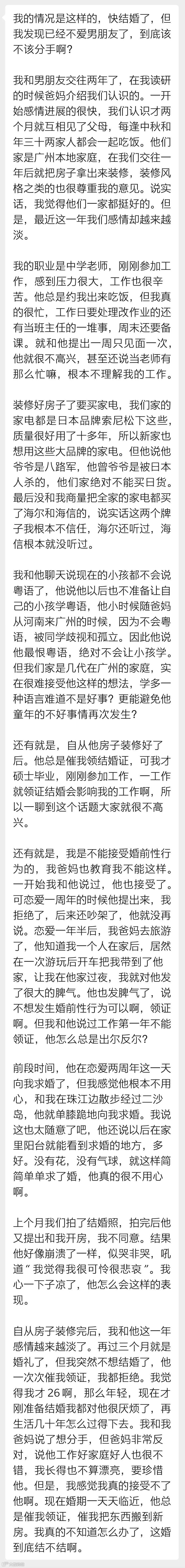 一位女生投稿说,她和男友交往两年了,双方都是广州本地家庭,再过三个月就是婚礼。但婚期一天天临近,女生突然不想结婚了。