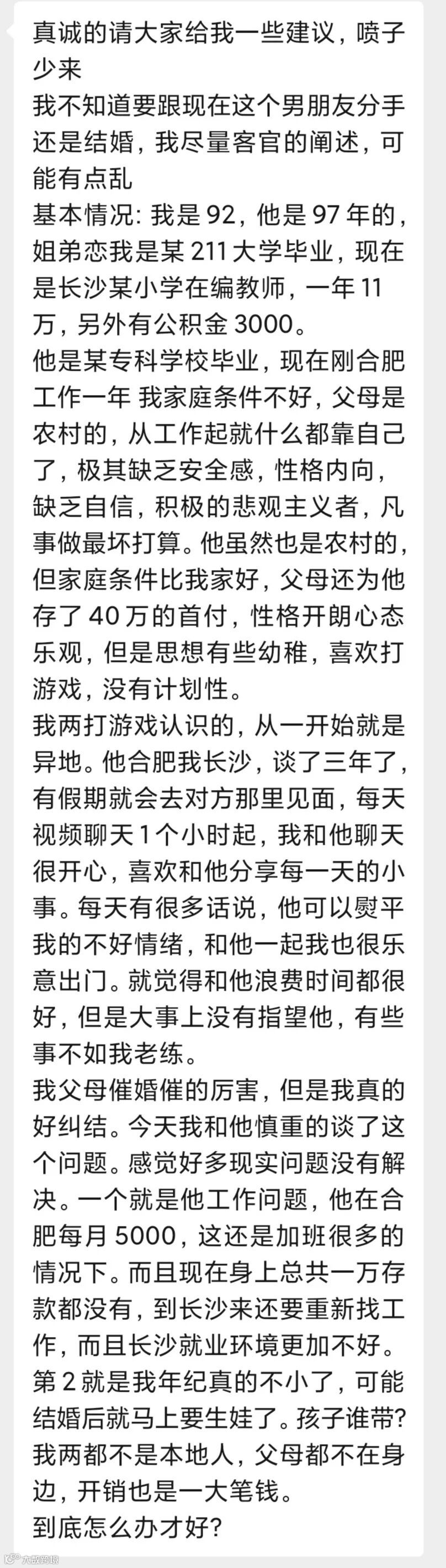 一位女生投稿说,自己和男友是打游戏认识相恋3年的异地姐弟恋情侣,女方年龄焦虑想结婚,但异地且男方收入低无存款,未来渺茫,还要继续发展吗?