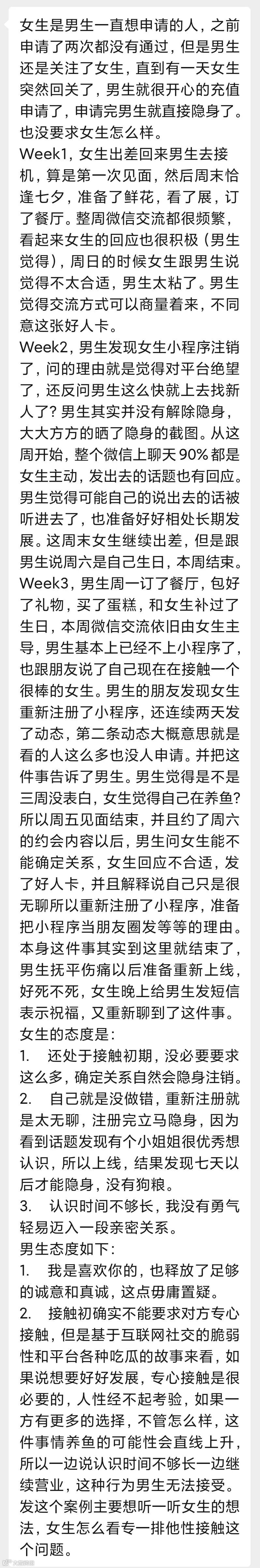 第二周男生发现女生注销了,问原因她说绝望了,男生也告诉女生自己隐身了。女生开始主动找男生聊天,基本都由她发起话题,男生感觉俩人在往好的方向发展了。周末女生过生日但要出差,就没见面。