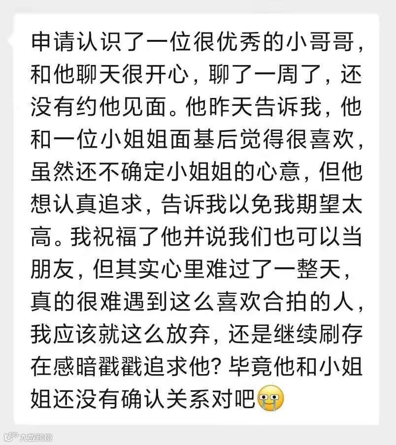 女生很难过,觉得很难遇到这么喜欢又合拍的人,想问问大家,她应该就这么放弃,还是以朋友之名继续刷存在感“追求”他?
