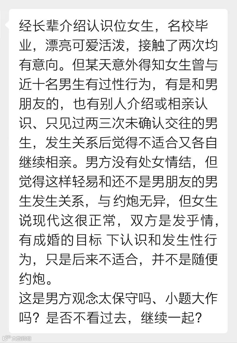 一位男生投稿说,自己经长辈介绍认识了一位女生,她名校毕业,漂亮可爱活泼,接触了两次,两人都有交往意向。但某天意外得知女生曾与近十名男生发生过关系,有是和男朋友的,也有和只见过两三次未确认交往的男生,发生关系后觉得不适合又各自继续相亲。