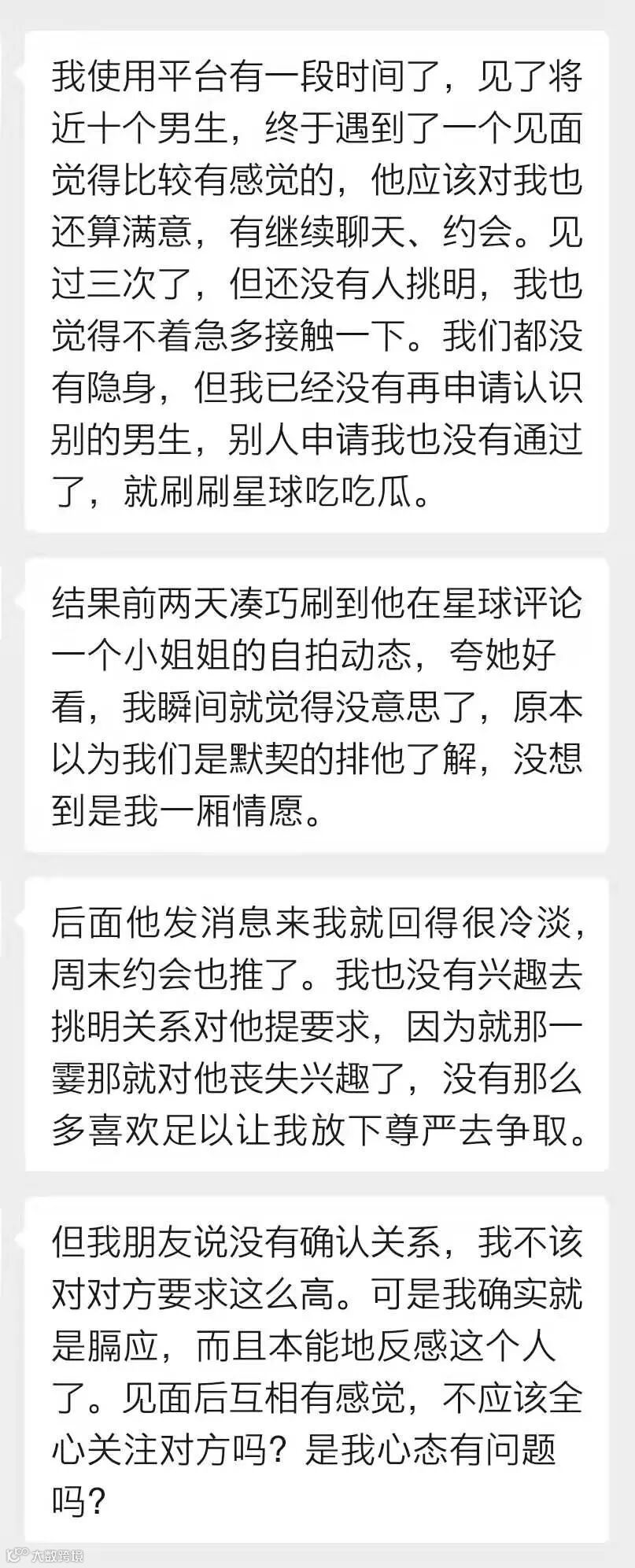 一位女生投稿说,她见了近十个男生,终于遇到了一个比较有感觉的,对方对她也挺满意,两人有继续聊天、约会,见过三次了。