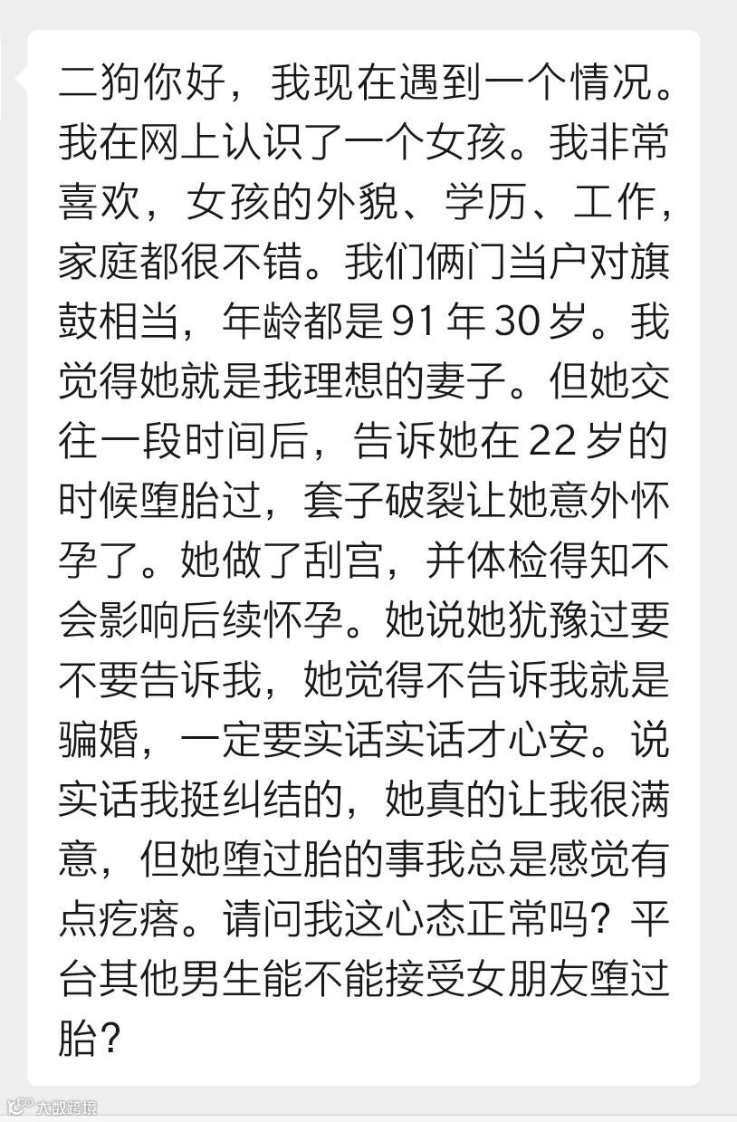 但交往一段时间后,女友告诉他自己22岁时曾意外怀孕堕胎过,后来有体检知道不会影响后续怀孕。