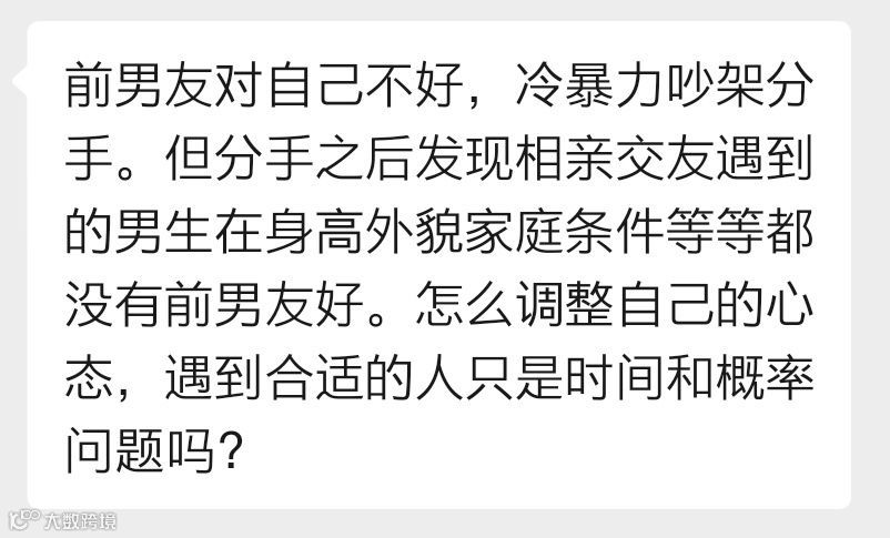 但分手之后发现相亲交友遇到的男生各种条件都不如前男友,包括身高、外貌、家庭条件等等。