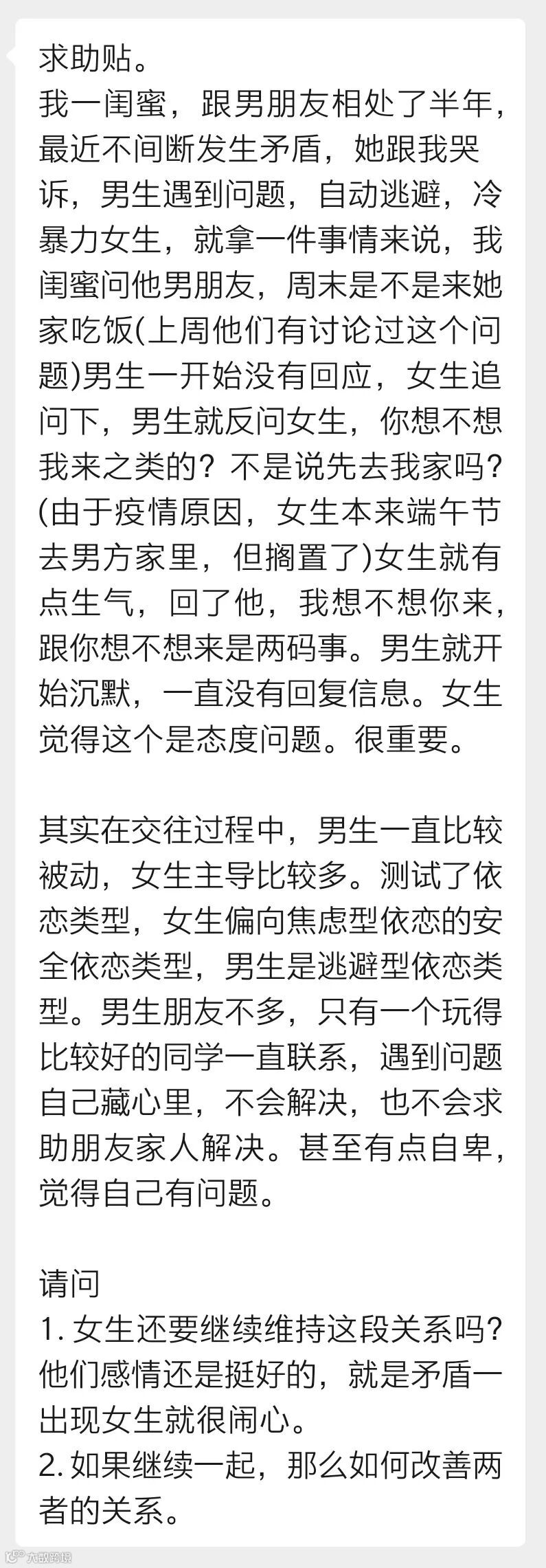 情侣恋爱半年,女生哭诉说,男友遇到问题总是逃避冷暴力,交往过程中也是她主导他被动。测试了依恋类型,女生偏向焦虑型,男友偏向逃避型。