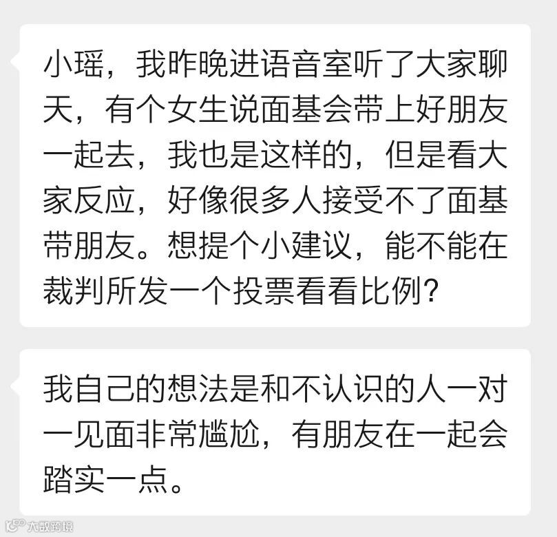 但在本周四的语音聊天室中,她发现很多单身朋友表示不能接受面基时对方带朋友。她希望在裁判所发起投票,看看能接受和不能接受面基带朋友的人的比例各占多少。