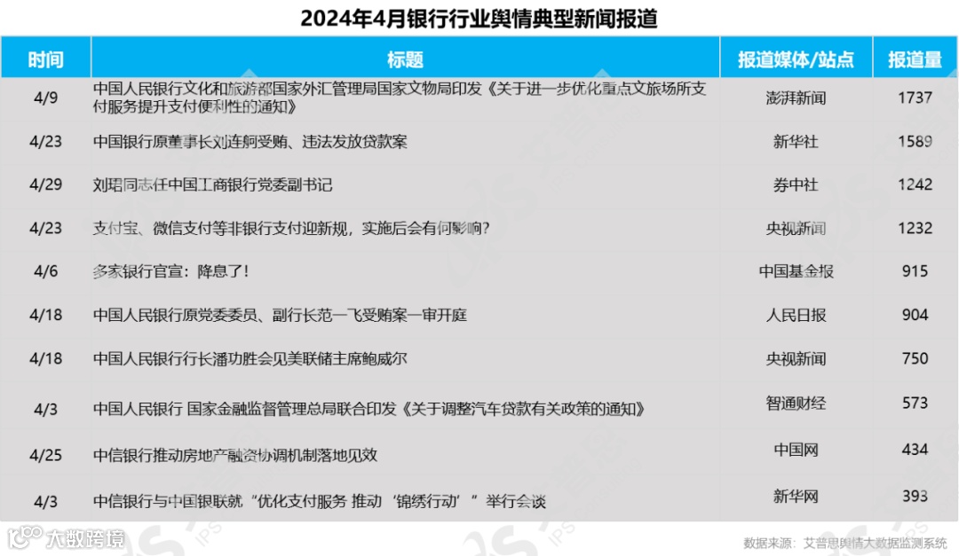 本报告基于2024年4月银行业线上公开舆情数据,从行业发展状况、舆情态势、机构/品牌舆情表现、重点舆情话题及事件等维度,对本月银行业网络舆情进行追踪和解读,以期为银行机构声誉风险管理提供参考。