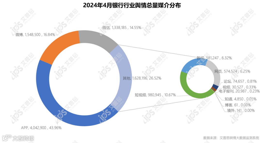 4月,银行业舆情声量来源中,占比最高的媒介为APP,达43.96%,舆情声量为4,042,900篇次;其次为微博,舆情声量达1,548,500篇次,占比16.84%;排名第三的是微信,舆情声量达 1,338,185篇次,占比14.55%;其他媒介中,短视频、新闻、网页等媒介的总占比达26.52%,舆情声量为1,628,196篇次。
