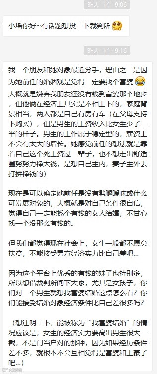 她希望在裁判所调研一下,女生们,尤其是经济条件较好的,会愿意接受经济条件与自己相比较悬殊的另一半吗?大家对男生希望找个经济条件比自己好很多的另一半怎么看?欢迎投票和留言讨论。