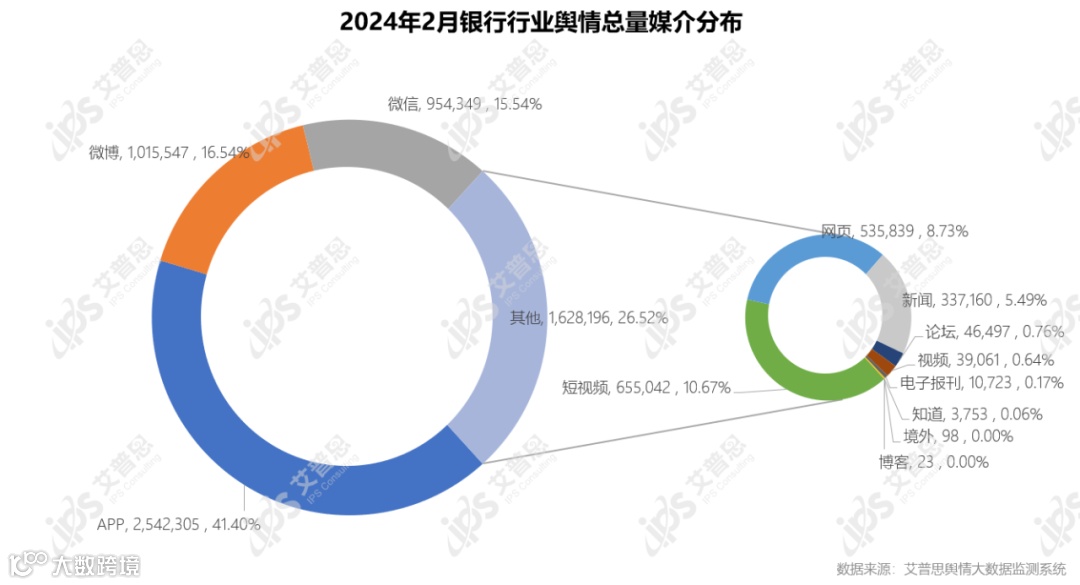 2月,银行业舆情声量来源中,占比最高的媒介为APP,达41.40%,舆情声量为2,542,305篇次;其次为微博,舆情声量达1,015,547篇次,占比16.54%;排名第三的是微信,舆情声量达 954,349篇次,占比15.54%;其他媒介中,短视频、新闻、网页等媒介的总占比达26.52%,舆情声量为1,628,196篇次。