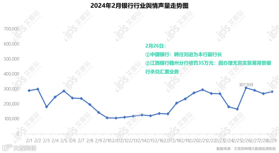 艾普思舆情大数据监测系统显示,2月,涉及银行业的舆情声量为6,140,397篇次,环比下降约27.86%(2024年1月舆情声量为8,512,909篇次),日均声量达211,737篇次。声量高峰主要出现在2月26日(平均声量307,939篇次),主要受“中国银行:聘任刘进为本行副行长”、“江西银行赣州分行被罚35万元:因办理无真实贸易背景银行承兑汇票业务”等相关信息影响。