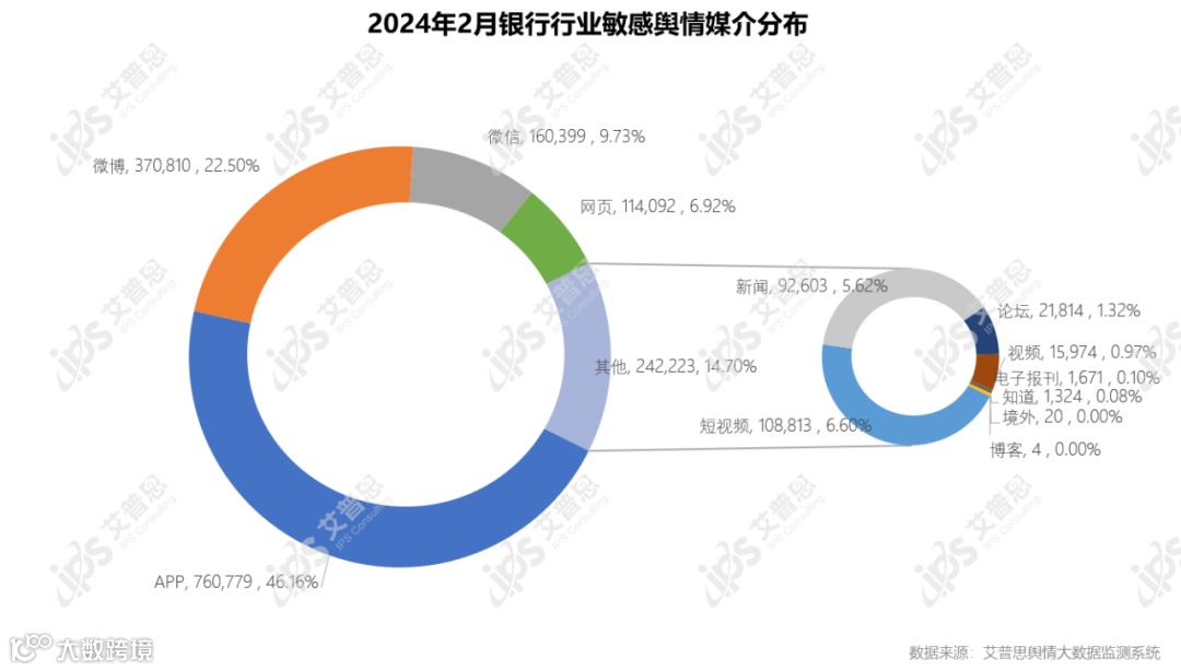 2月,银行业敏感舆情声量来源中,占比最高的媒介为APP,达46.16%,舆情声量为760,779篇次;其次为微博,舆情声量达370,810篇次,占比22.50%;排名第三的为微信,舆情声量为160,399篇次,占比9.73%;第四为网页,舆情声量为114,092篇次,占比6.92%;其他媒介中,新闻、短视频、论坛等媒介的总占比达14.70%,舆情声量为242,223篇次。
