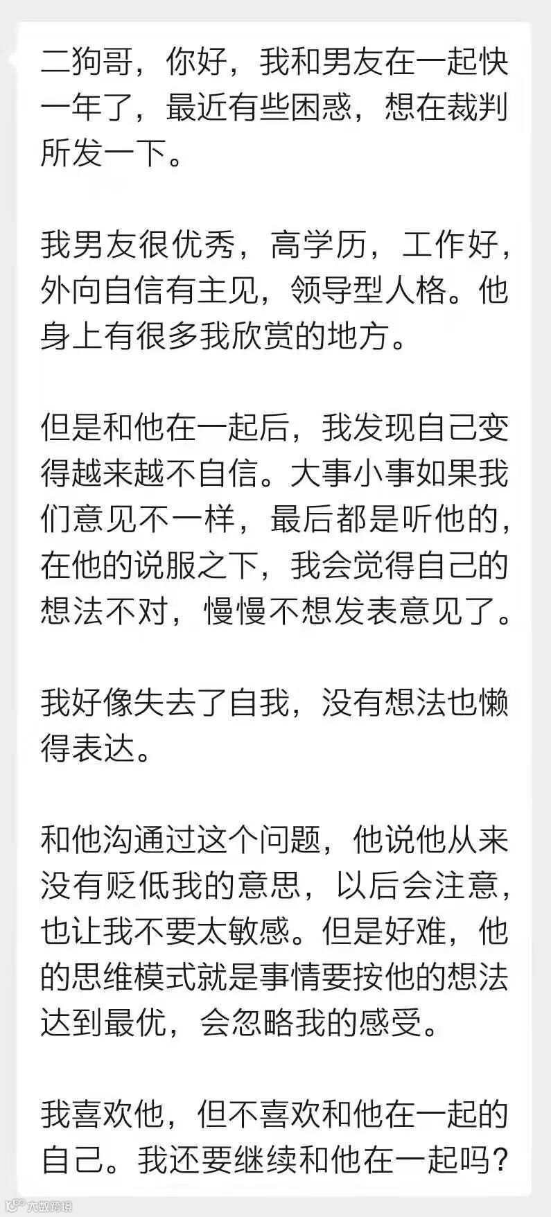 但女生觉得,在这段关系中,她越来越没有自我了。因为大事小事最后都是听男友的,她渐渐觉得自己说什么都不对,懒得发表想法了。