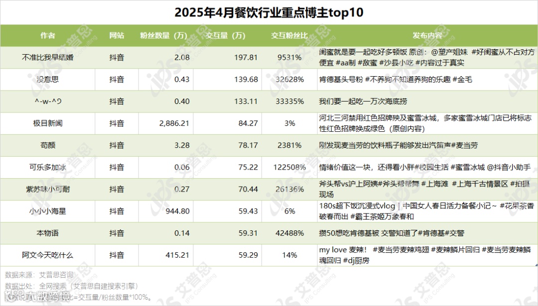 2025年4月,不准比我早结婚、没意思、^-w-^੭等博主获得交互量较高,可乐多加冰、本物语、^-w-^੭等博主交互粉丝比较高。从发布内容来看,消费者拍摄的品牌相关趣味视频最受欢迎。