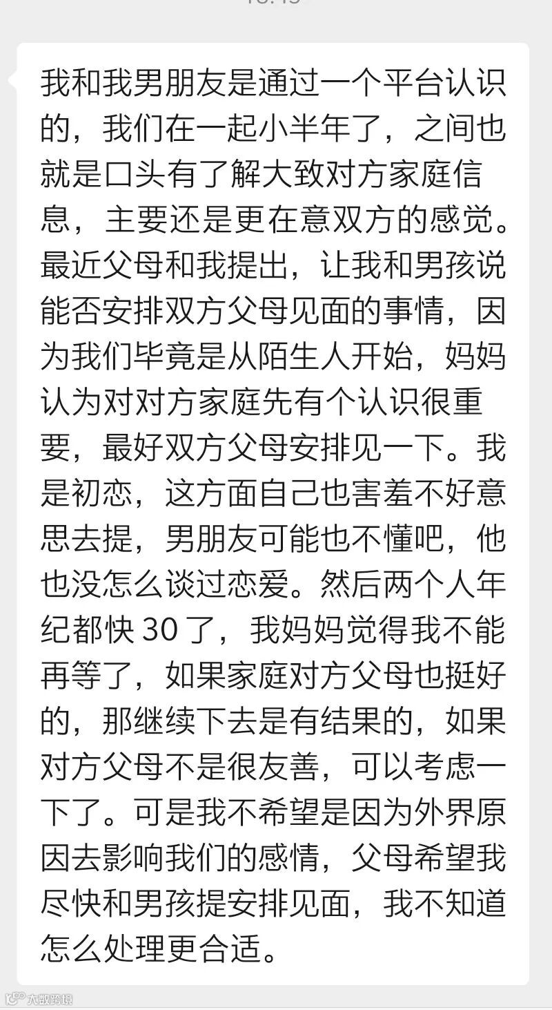 ,她和男友在一起半年,她父母提出双方父母尽早见一见,对方父母人好就继续发展,不好就早做打算。