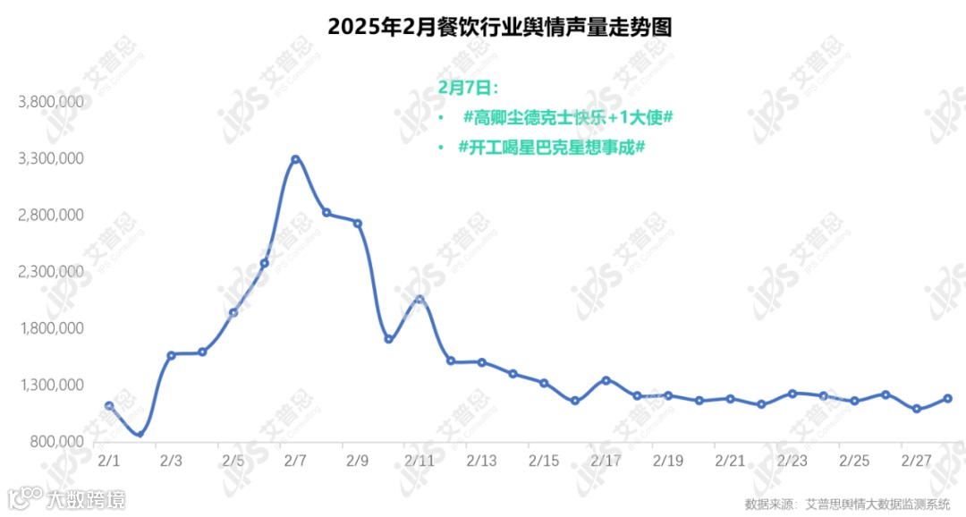艾普思舆情大数据监测系统显示,2月,涉及餐饮行业的舆情声量为43,355,407篇次,较上月有所增加(1月61,358,035篇次),日均声量达1,548,407篇次。从声量走势来看,声量高峰期在2月7日,主要由“#高卿尘德克士快乐+1大使#”和“#开工喝星巴克星想事成# ”相关宣传带动声量。