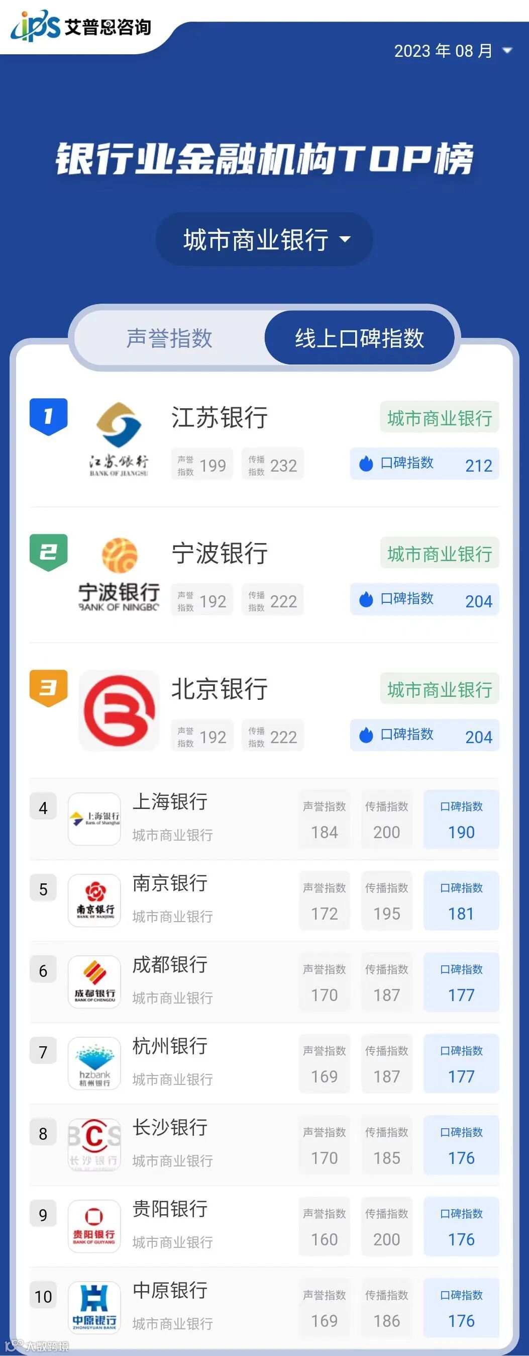 线上口碑指数排名前三的国有大型商业银行为:农业银行、工商银行、建设银行;线上口碑指数排名前三的股份制商业银行为:招商银行、中信银行、民生银行*;线上口碑指数排名前三的城市商业银行为:江苏银行、宁波银行、北京银行;线上口碑指数排名前三的民营银行为:微众银行、网商银行、新网银行;线上口碑指数排名前三的外资法人银行为:汇丰银行、渣打银行、瑞士银行。