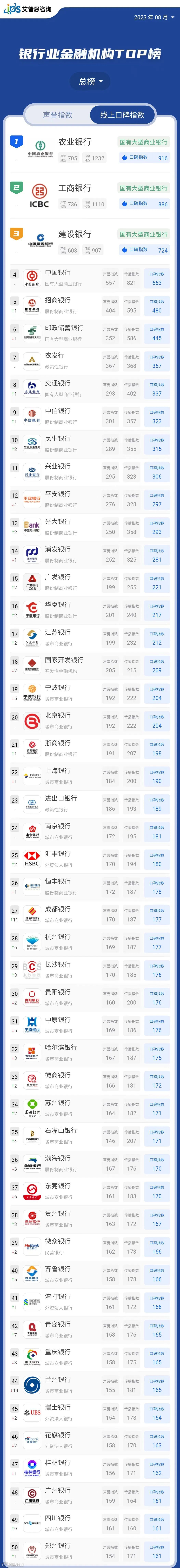 线上口碑指数排名前50的银行业金融机构中,包括城市商业银行24家、股份制商业银行12家、国有大型商业银行6家、外资法人银行4家、政策性银行2家、民营银行1家、开发性金融机构1家。