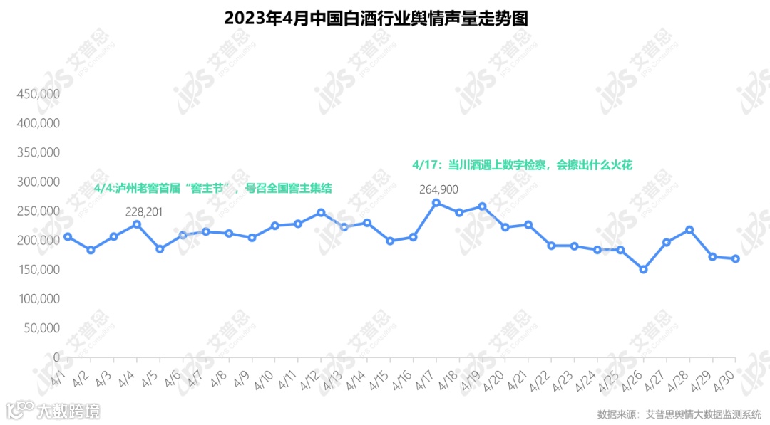 艾普思舆情大数据监测系统显示,4月,涉及白酒行业的舆情声量为6,299,235篇次,较上月大幅增加(3月舆情声量7,573,670篇次),日均声量达209,974 篇次。其中,声量极值出现在4月17日(单日声量264,900篇次),声量高点主要受《当川酒遇上数字检察,会擦出什么火花》《打造川酒全产业链条保护体系》等报道影响。