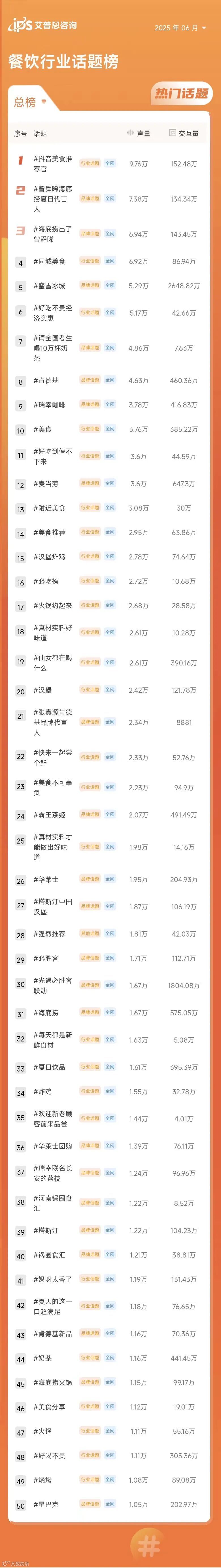 2025年6月餐饮行业排名前三的热门话题为:#抖音美食推荐官(行业话题,声量9.76万,交互量152.48万)、#曾舜晞海底捞夏日代言人(品牌话题,声量7.38万,交互量134.34万)、#海底捞出了曾舜晞(品牌话题,声量6.94万,交互量143.45万)。