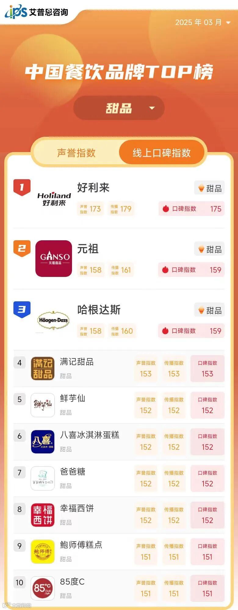线上口碑指数排名前三的甜品品牌为:好利来、元祖、哈根达斯;线上口碑指数排名前三的饮品品牌为:蜜雪冰城、霸王茶姬、星巴克;线上口碑指数排名前三的日韩料理品牌为韩宫宴*、大渔铁板烧、汉拿山;线上口碑指数排名前三的西餐品牌为豪客来、牛约堡、萨莉亚*。