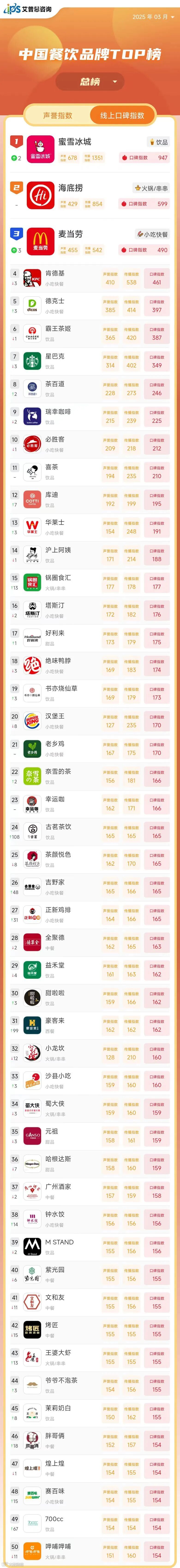从子指数的表现来看,3月传播指数、声誉指数最高的餐饮品牌均为蜜雪冰城(传播指数1351,声誉指数678)。