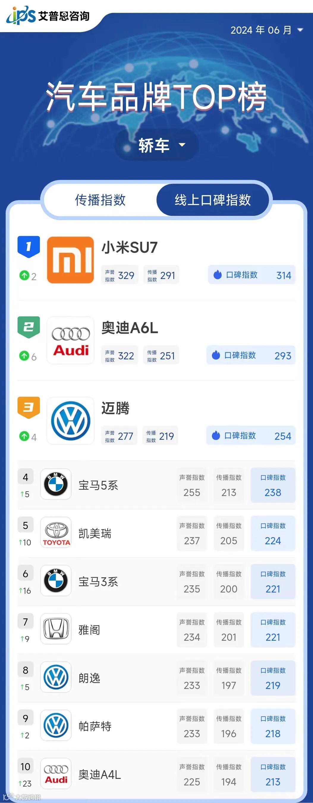 线上口碑指数排名前三的轿车车型为:小米SU7、奥迪A6L*、迈腾*;线上口碑指数排名前三的SUV车型为:问界M9*、揽胜*、哈弗H6*;线上口碑指数排名前三的MPV车型为:别克GL8、格瑞维亚、埃尔法*;