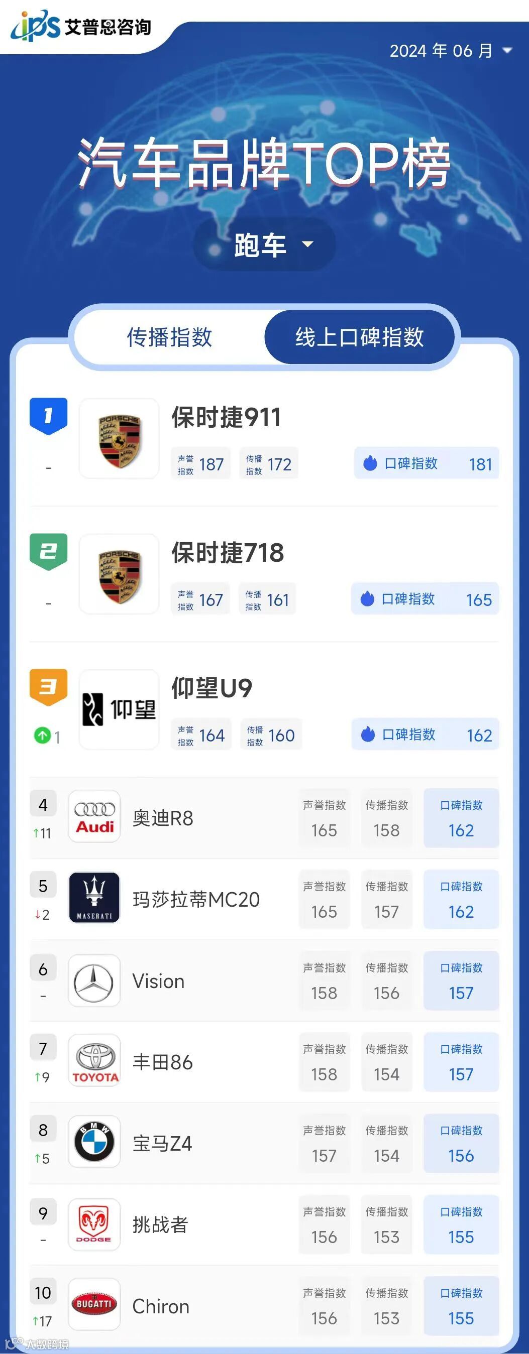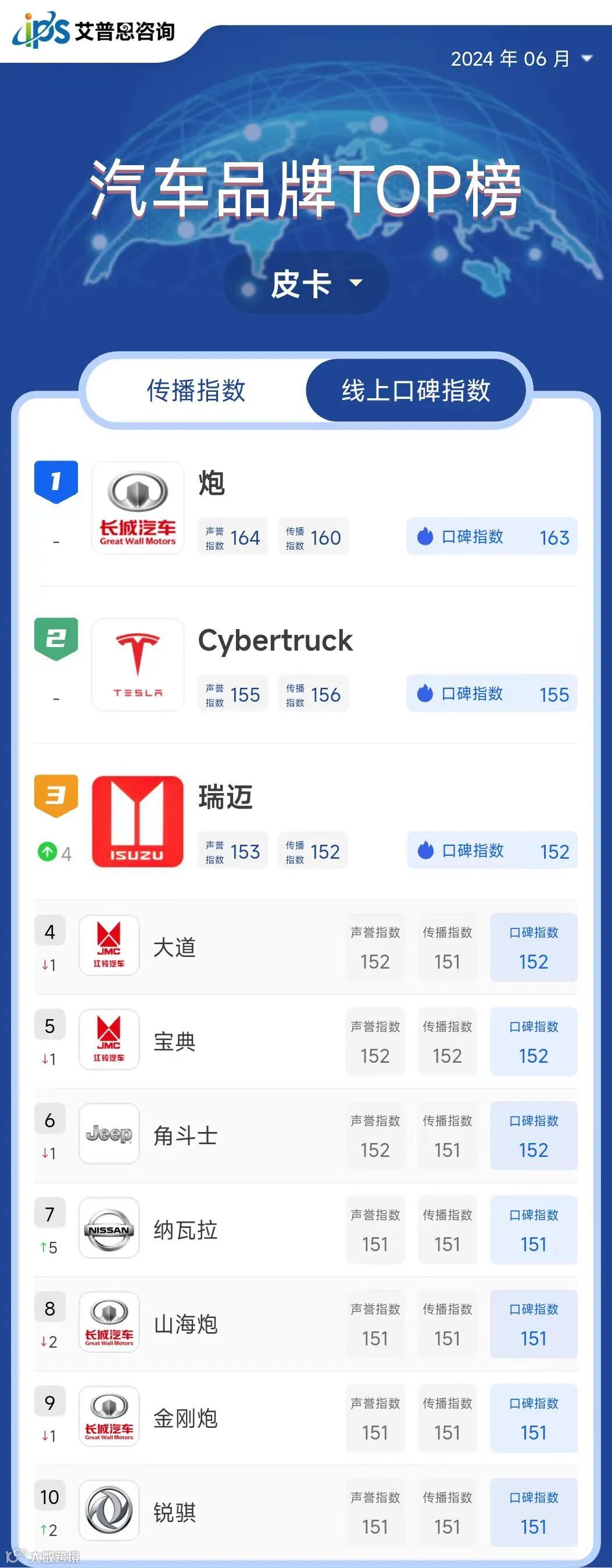 线上口碑指数排名前三的跑车车型为:保时捷911、保时捷718、仰望U9*;线上口碑指数排名前三的皮卡车型为:炮、Cybertruck、瑞迈*。