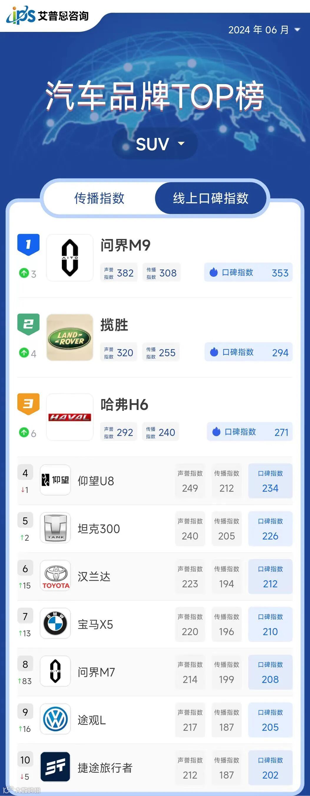 6月线上口碑指数排名前三的汽车车型为:问界M9(口碑指数353,排名较上月上升11位)、小米SU7(口碑指数314,排名较上月上升1位)、揽胜(口碑指数294,较上月上升13位)。