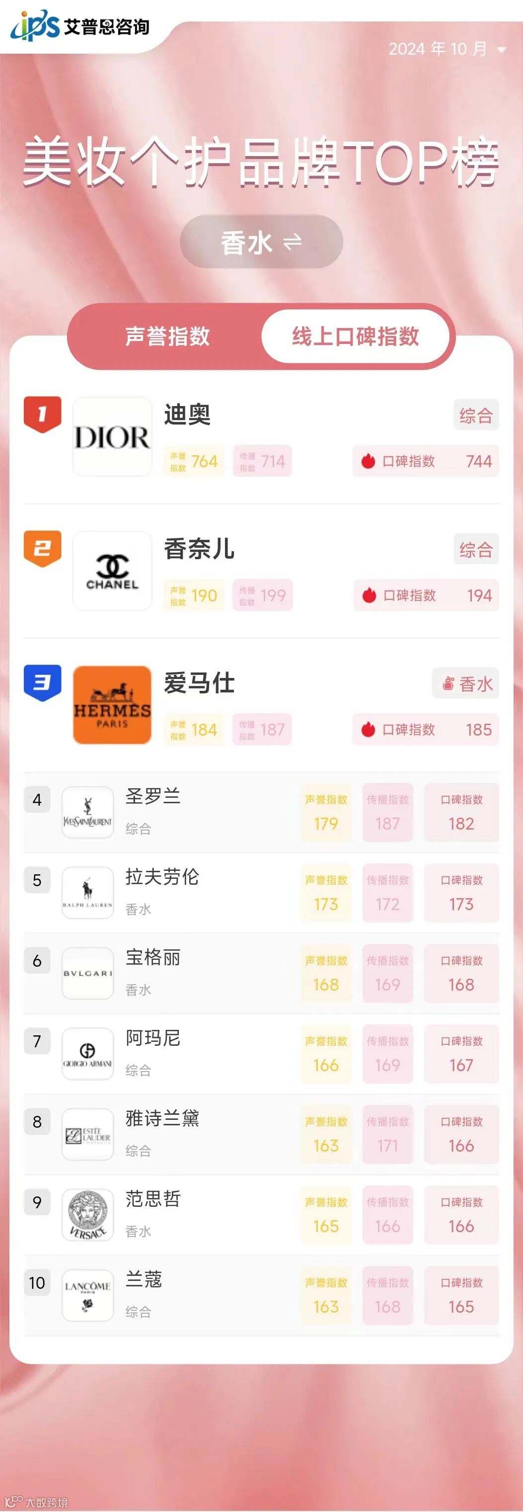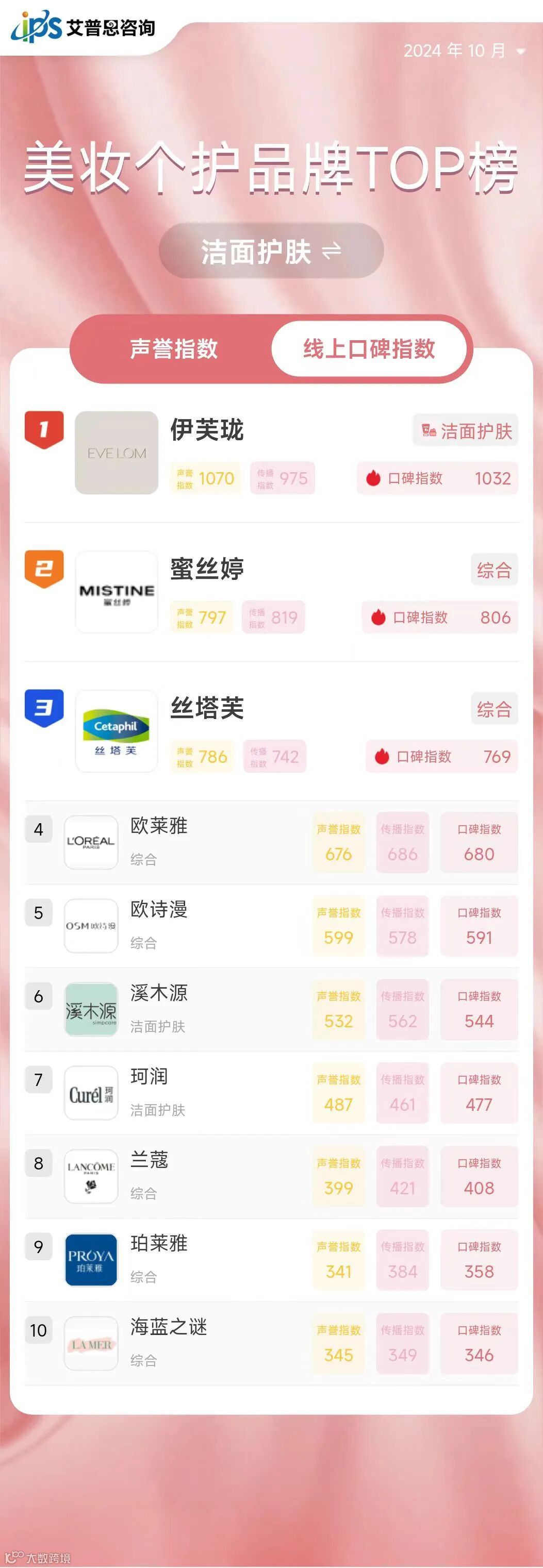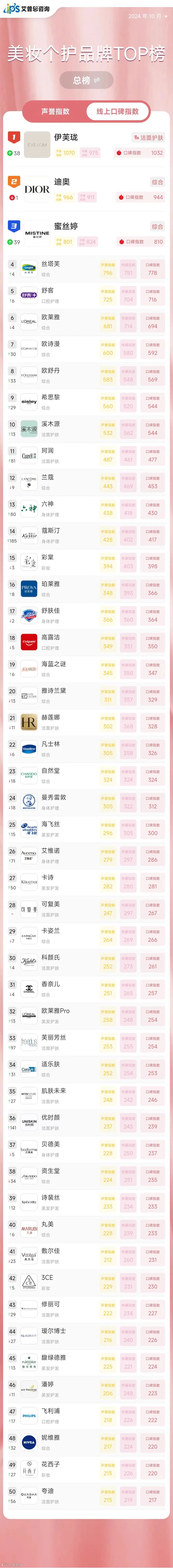 2024年10月线上口碑指数排名前三的美妆个护品牌为:伊芙珑(洁面护肤,口碑指数1032,排名较上月上升38位)、迪奥(综合,口碑指数944,排名较上月下降1位)、蜜丝婷(综合,口碑指数810,排名较上月上升39位)。