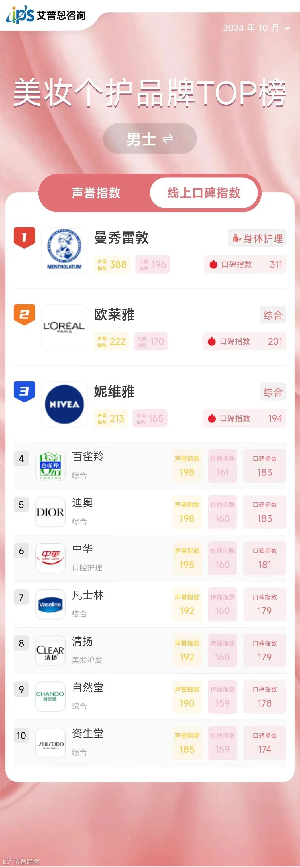 线上口碑指数排名前三的男士护肤品牌为:曼秀雷敦、欧莱雅*、妮维雅*。